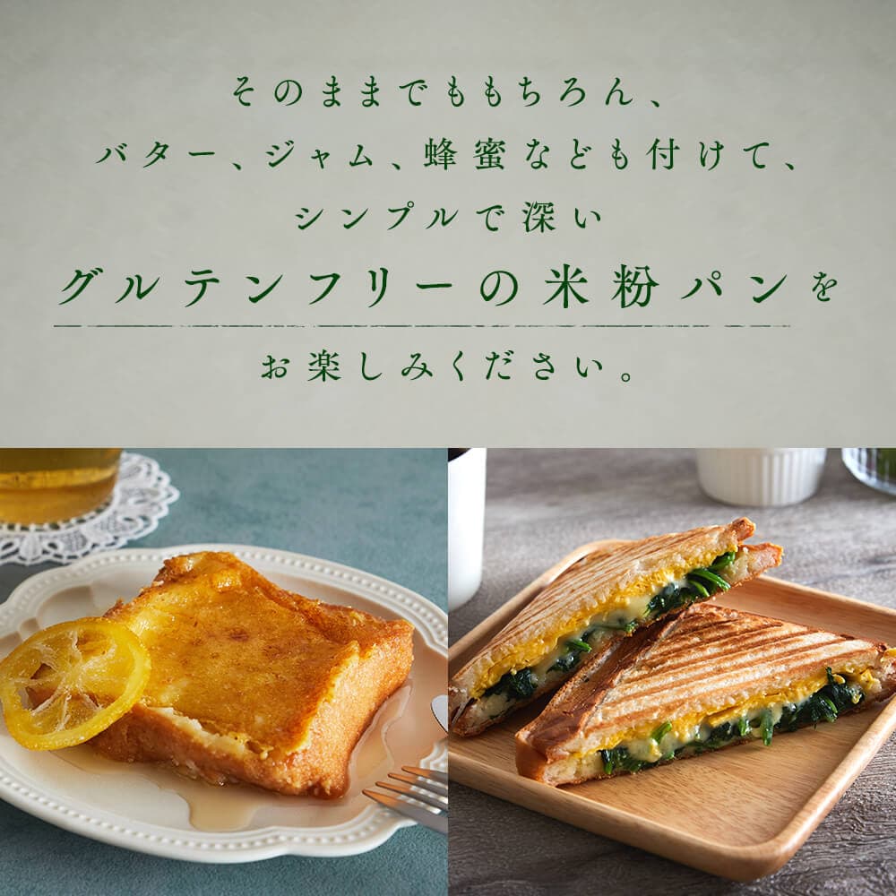 トーストすると、外はカリカリ、中はフワフワとした食感が楽しめます。そのままでももちろん、バター、ジャム、蜂蜜などを付けても美味しく、シンプルながらも奥深いグルテンフリーの米粉パンを存分にお楽しみいただけます。どんな食卓にも馴染むシンプルさ
